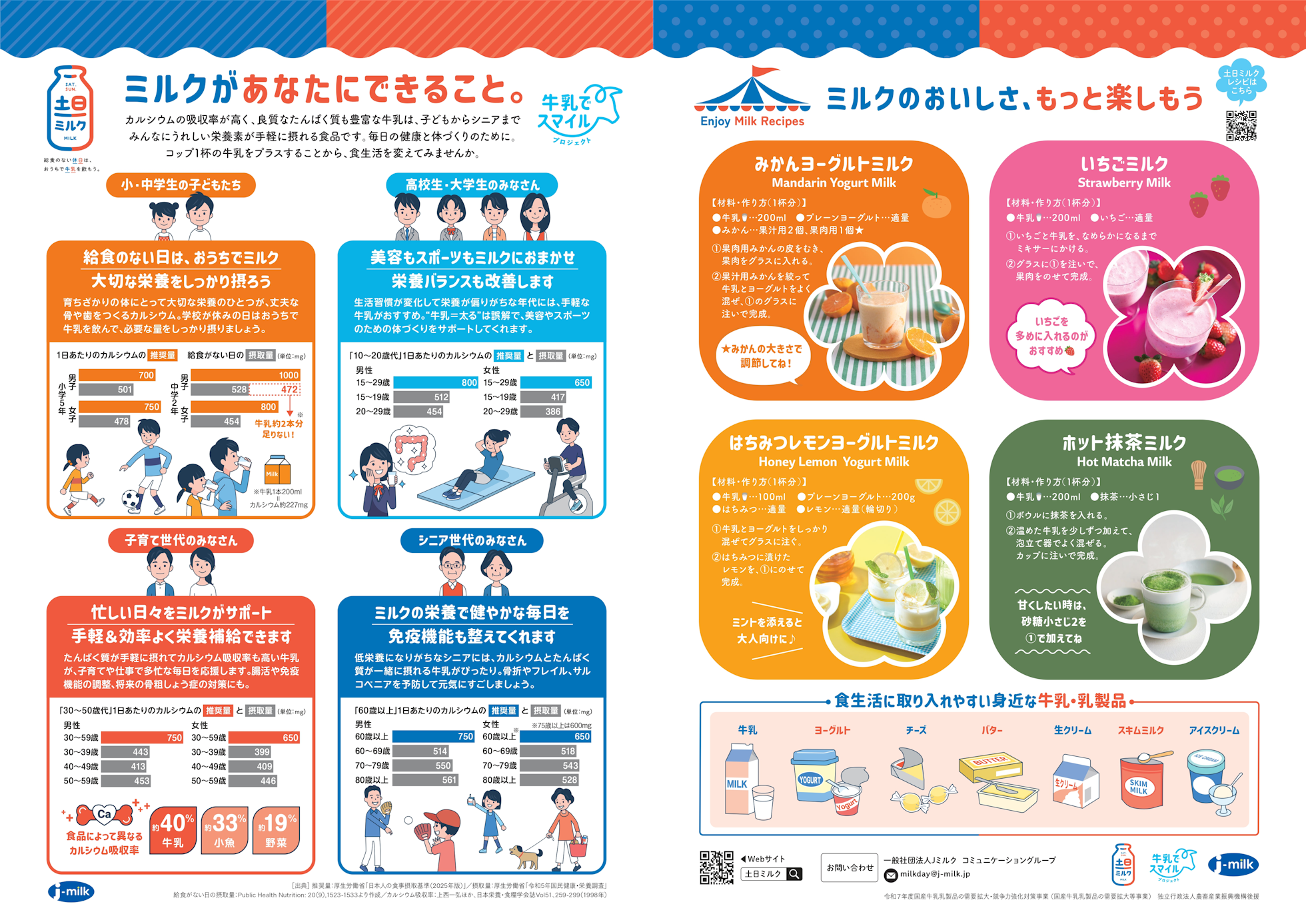 ご家庭での牛乳飲用・利用の促進のため、学校や地域などと連携し、食育プログラムのデータ提供や、牛乳にまつわる話だけのSNS漫画雑誌、週末の料理の新定番となるレシピ、ロゴやイベントツールの提供、そのほか土日ミルクの活用事例などを公開しています。