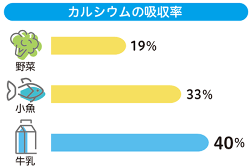 上西一弘さん(以下、上西):過去に試験をしたところ、牛乳の中のカルシウムは体内で吸収率が40%ほどであるのに対し、小魚でおよそ33%、小松菜やモロヘイヤなどの野菜はおよそ19%でした。牛乳にはカルシウムの吸収を良くする成分が入っています。牛乳のタンパク質のカゼインが消化管の中で分解される時にカルシウムの吸収を促進する物質ができますし、大腸でのカルシウムの吸収を良くする乳糖なども含まれています。
