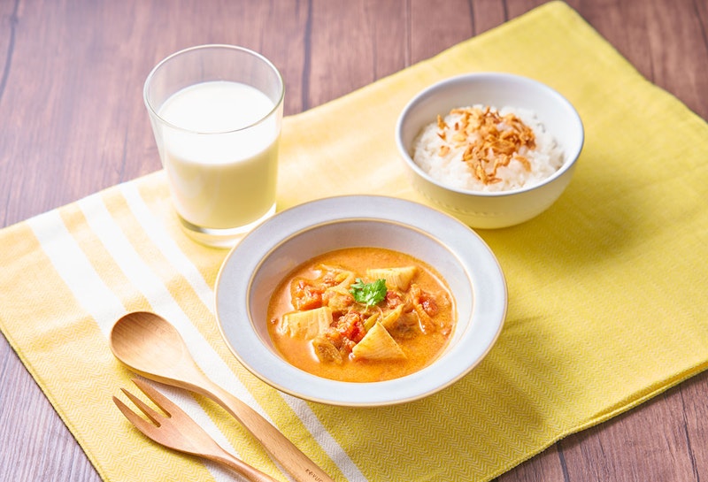 玉ねぎが色づいてきたら、鶏肉を入れて炒める。表面に火が入ってきたら、たけのこを入れてさっと炒め、トマト缶、コンソメ、カレー粉、砂糖、水を入れて中火にかける。ひと煮立ちしたら弱火にし、トマトを潰しながら蓋はせずに30−40分煮る。5.牛乳を加える