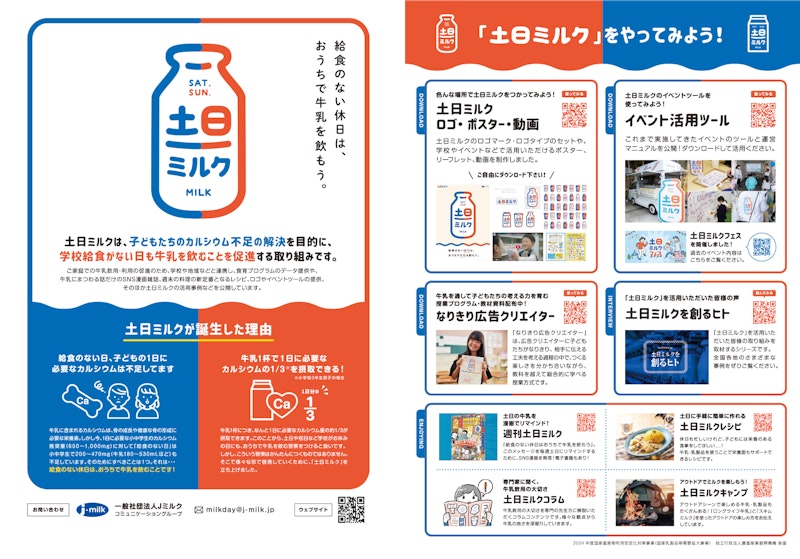 全国の皆さんに「土日ミルク」を知っていただくため、学校やイベントなどで活用いただくポスター、リーフレット、シール、動画を制作しました。ご自由にダウンロード下さい。