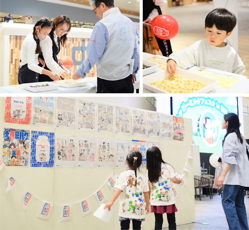 ハッピーミルクフェスタの会場には、『土日ミルク』ロゴ入り風船やオリジナル牛乳コップ作り、漫画「週刊土日ミルク」、牛のエサ展示、牛さんクイズなど『土日ミルク』を参考にしたコンテンツがずらり。