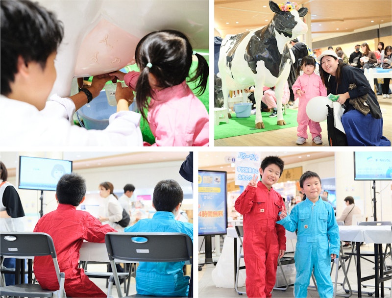 会場を見渡すと、赤や黄、緑など色とりどりの作業服の子供たちの姿もちらほら。まるで小さな酪農家さながらの子どもたちが夢中になってコンテンツに取り組む姿に、周囲の大人たちは自然と笑顔で見守ります。